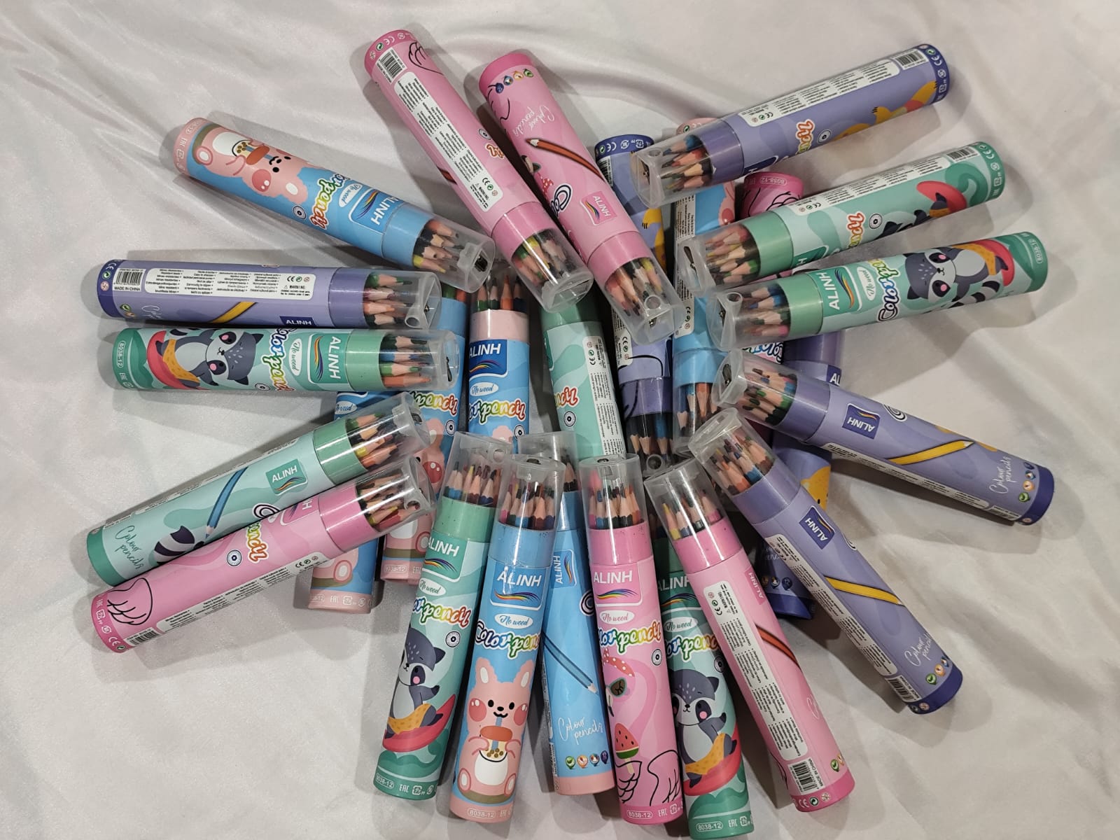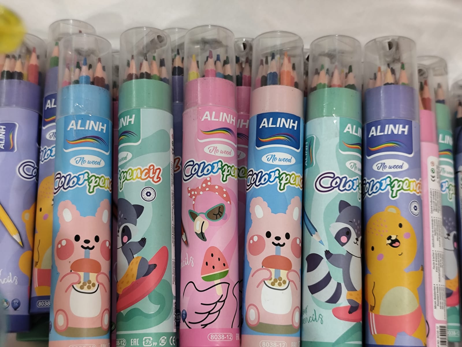 12 wooden color pencils and a sharpener.