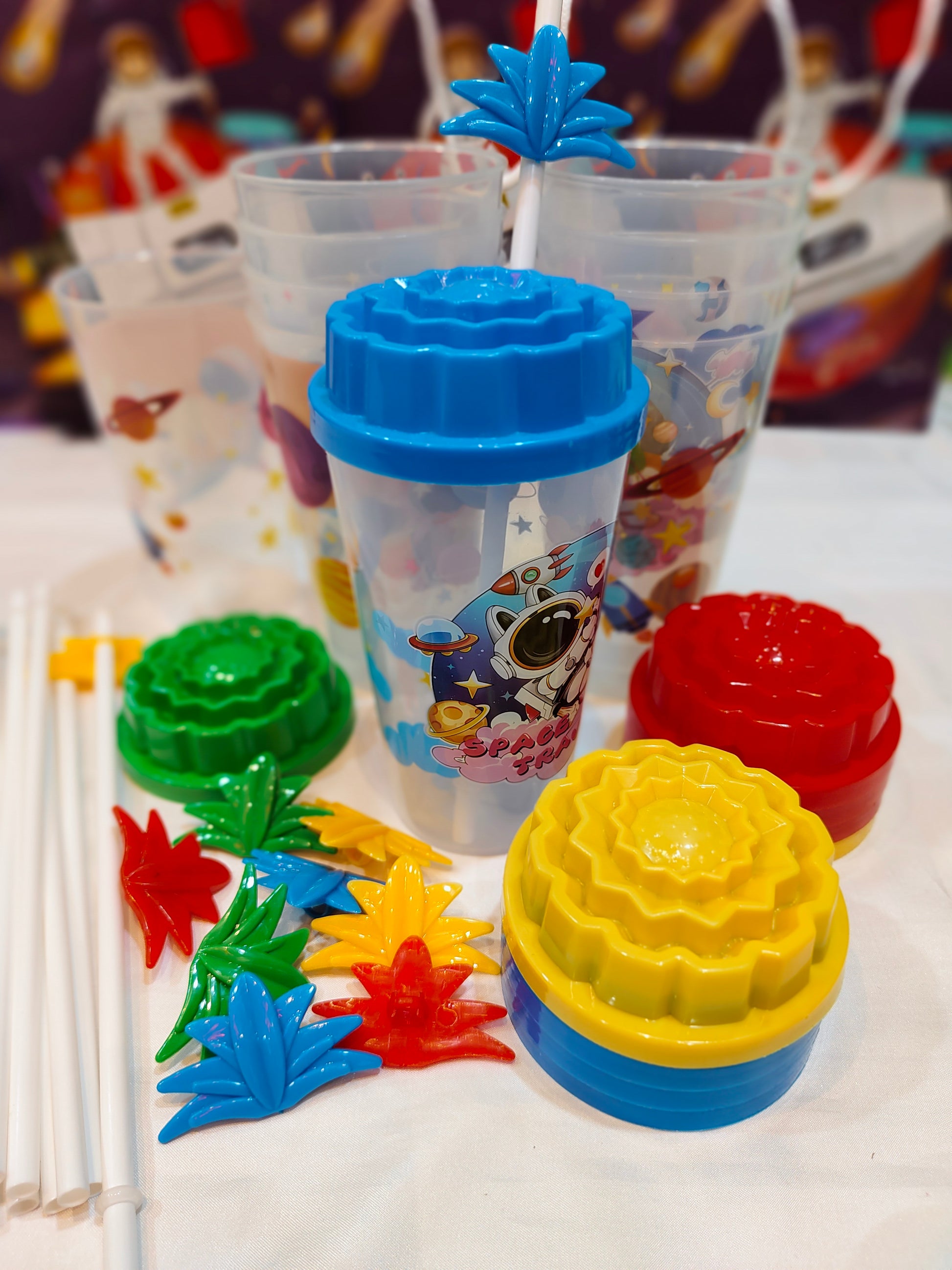 - 6 items will be included in a single pack : 1 space print Sipper + 1 space Highlighter + 1 space Eraser + 1 space Sharpener + 1 packet of glow in dark stars + 1 Paper bag